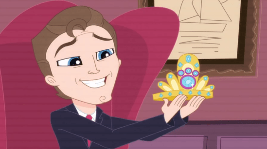 Fast forward a few days, and after a sunrise not even Celestia could match in efficiency, it’s pageant time. We meet Judy Jo Jameson, this episode’s overbearing captain of crazy; Princess Stori, her dog; and her neice-in-law, Philippa; who arrive in a CG van with a plywood cutout of the dog on top.