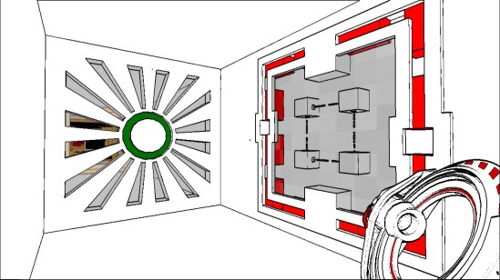 In fact, I could write a better story in two minutes. For starters, we’d actually have an opening. You’d wake up in the map room, and there’d be a short sequence of the player standing up. Then the game would proceed exactly as it does. And then, at the end, the player would be trapped in a room with stark white walls. They’d slowly fade to black, then we’d see one of the walls drop off. You walk outside into a brown industrial warehouse, and looking behind you see a massive structure, filled with cubes moving about, from side to side, and back and forth.