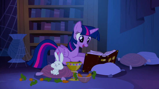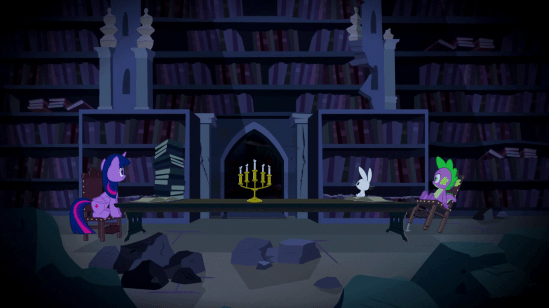 They reconvene in the library, and Twilight explains that she wasn’t scared because she was reading.