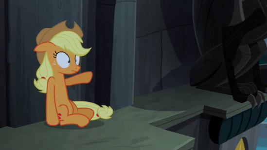 They begin running around like maniacs. Applejack and Rainbow ricochet off the walls; Fluttershy spots a rabbit-like shadow puppet made of rocks before Applejack knocks a column atop of it, triggering a secondary panic attack; and Rarity ends up crying under a tapestry.