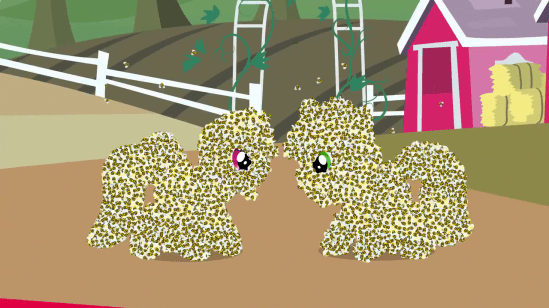 Meanwhile, Applejack and Rainbow Dash are having one of their standard ego competitions, where they find out who’s the most ‘daring.’ The latest round of which involves being covered in bees.