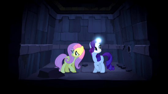 Meanwhile, Rarity is on a mission, she heard that the old castle ruins in the Everfree Forest hold a lot of ancient artwork. So she decided to drag Fluttershy along to procure the art for restoration.
