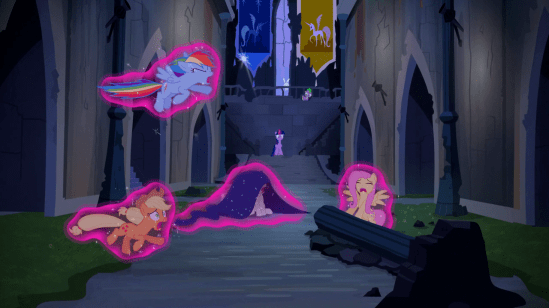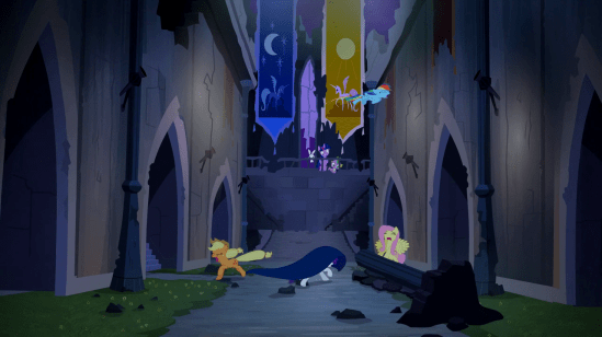 But they still need to finish the competition, and Applejack thinks up another challenge, at the old castle ruins in the Everfree Forest.