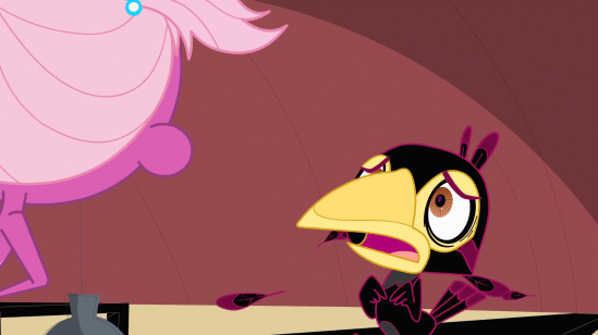 So, Blythe comes up with a new plan. Minka climbs up into the rafters, and meets up with Desi, Ramon’s Myna Bird. And we quickly learn that Desi’s a nervous wreck.