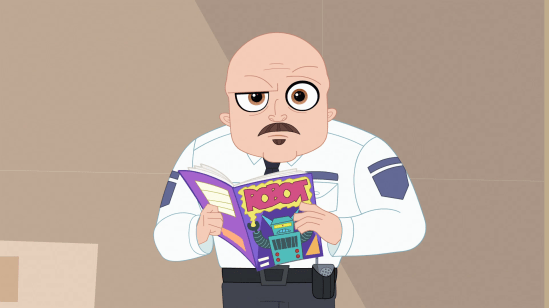 We then cut to Blythe, who decides to hide out in a storage closet. Where a janitor arrives, and inadvertently abducts Russell, mistaking him for a scrubbing sponge, or something.