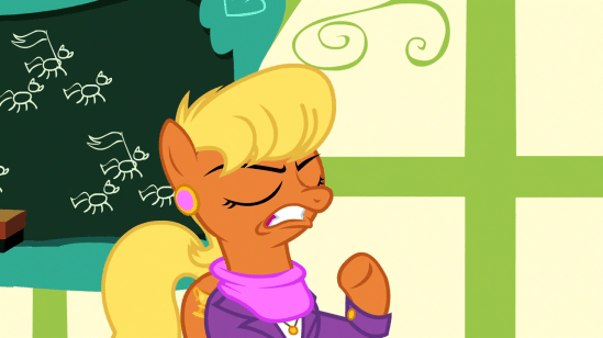 The show opens at the local elementary school, where the head of the Equestria Games is introduced: Ms. Harshwhinny! What? I thought she was just an inspector for the games. Look, writers, I know we all want to pretend season three didn’t happen, but could you guys at least try to maintain a level of consistency?