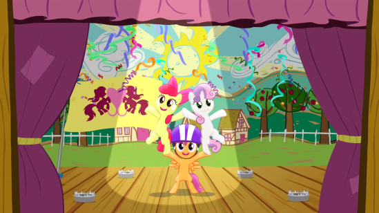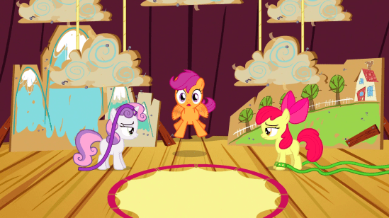 As the song closes they get a bit of trash-talk from Diamond Tiara. Trash talk that can be summed up as: You have no cutie mark, therefore you suck. Can she come up with something different next time? PLEASE!? She’s like a damaged record, repeating the same eight-second loop over and over again. It’s getting old.