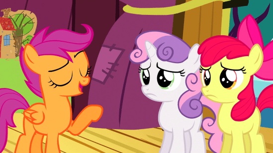 Early the next morning, they’re all ready to leave, except Scootaloo, who refuses to go because she can’t fly. Sweetie Belle tries to talk her out of it, and Apple Bloom tries to talk Sweetie Belle out of talking her out of it.