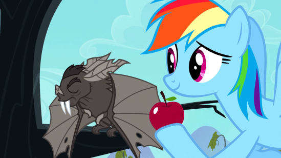 But sadly, Applejack’s more focused on solving sort-term problems, than gaining long-term benefits. Part of the problem may be Granny Smith’s stories about the last vampire fruit bat infestation. Apparently it caused a bit of a famine.