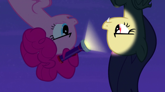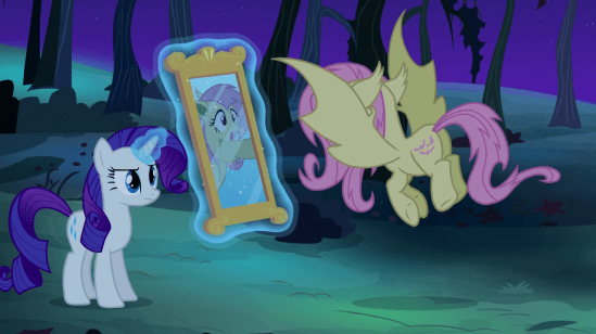 But here, Fluttershy obviously does cast a reflection. Still, it’s a nice homage to a classic Vampire trope. I think the intention here was to imply that Fluttershy is giving herself The Stare, but I like my interpretation, that she just hates mirrors. Though one would think she would just break it in that case. She finds them hypnotic, then.