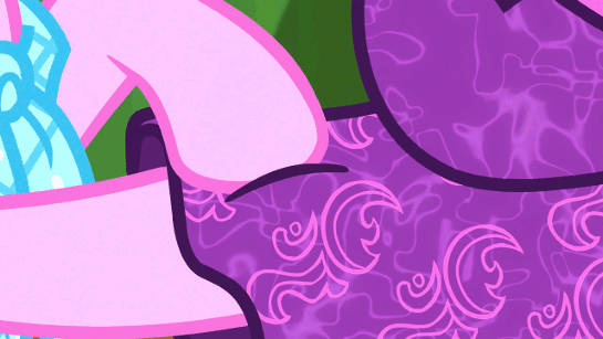 I really like this effect. Where the colours swoosh around. Obviously done with CG. It’s a really great look, and Suri’s equally impressed. She shares her own woes, apparently some of her designs still need work, and she realizes a bit of the magic fabric could be exactly what she needs. So Rarity gives her a whole fucking roll!