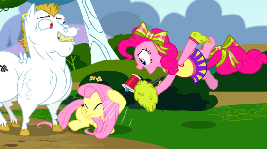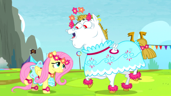 Then there was Fluttershy and Rarity, both of whom left their comfort zone to help their friend. Fluttershy isn’t much of an athlete, but she signed up anyway. And it quickly becomes obvious that Rarity never designed athletic outfits before.