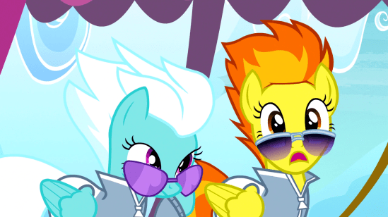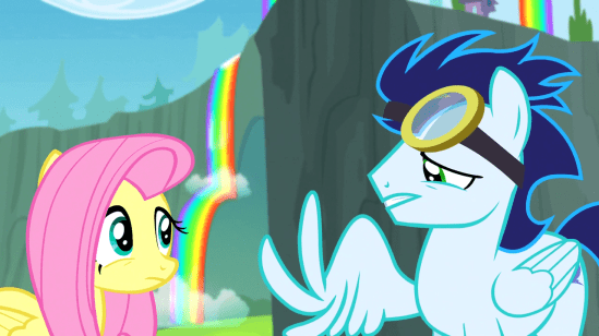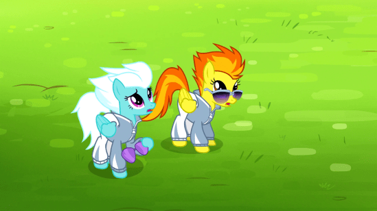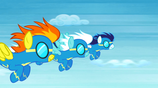Which is true. Then Spitfire and Fleetfoot reveal that Soarin’s still in the hospital, and he won’t be out until after the competition. So they ask Rainbow Dash to join permanently.