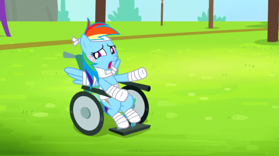 Thankfully, Rainbow’s in the area, and she actually gives a shit. So she saves his life, but his wing is still badly injured.
