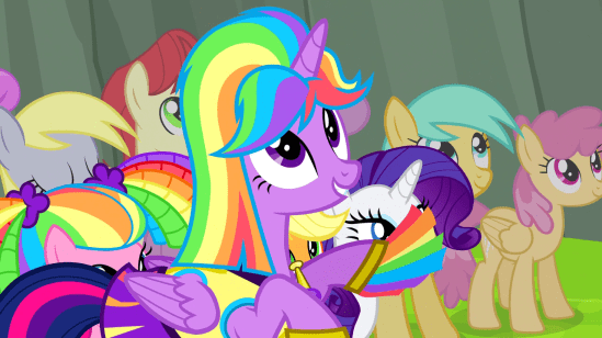 Then the same rainbow effect that made an appearance in Rarity’s eyes a few episodes ago, makes an appearance Rainbow Dash’s eyes, here. And I think I know why now, but I’m gonna hold onto it.