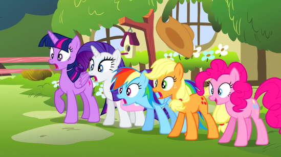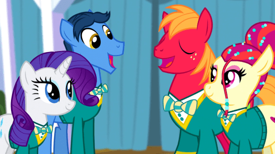 So we know they can sing, and sing well. But the next day, they can’t, since Big Mac (of all ponies) wore out his voice the night before. That’s right, Big Mac, the pony who has a running gag based on him rarely speaking on-screen, wore out his voice. I can’t tell if this is funny or irritating.