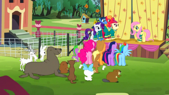 Anyway, it’s not long before Mac’s voice is all healed up, and now Fluttershy can retire from musical fraud. Woohoo!