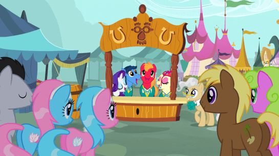 So we know they can sing, and sing well. But the next day, they can’t, since Big Mac (of all ponies) wore out his voice the night before. That’s right, Big Mac, the pony who has a running gag based on him rarely speaking on-screen, wore out his voice. I can’t tell if this is funny or irritating.