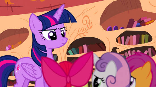 Anyway, Sweetie Belle has the great idea to let them come, because then these two idiots will have to learn new skills as well. So they go over to Twilight’s place, and Diamond is so excited to meet the princess and–doesn’t Twilight live in a public library!? That’s what I always assumed. If so, why is it such a big deal to meet her?