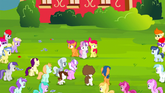 I mentioned this before. It seems quite odd to me that it’s still only those three (four if you count the one who lives in another city) who are part of the Cutie Mark Crusaders. And yet, there are at least half a dozen more blank flanks in that town that they haven’t bothered to recruit. It’s not because they don’t want new members, as we learned last season. So why are there only three?