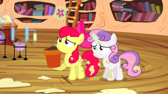 Anyway, they’re not that great at it. Sweetie Belle can barely move a broom, Scootaloo’s unicycle lies in tatters, and Apple Bloom is lamenting the fact that she can’t get a handle on making a growth potion. How does she know? No idea, because when she said that, she hadn’t even tested it. She made something though, but she hadn’t tested it. I have a feeling those lines were rearranged at some point, because it would make more sense if she tested it and saw it fail before whining. Actually it would’ve been much better if she acted as if she was a great potion maker, then tested the thing, and it burned a hole in the floor.