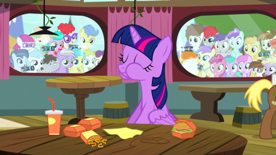 But then there’s Twilight. Throughout the episode, she seems perfectly fine being mobbed by legions of fans, and being stalked by the paparazzi while eating.