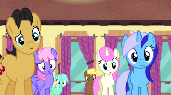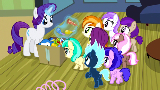 So, she begins leading Sweetie Belle through a flashback of her fifth birthday party, which Sweetie Belle narrates without any prompting. And it does feel a bit awkward, as she describes what Past-Belle’s doing, as they both watch her do it.