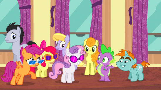 Spike congratulates them on a great show, but has to disappoint them, since Applejack, Rainbow Dash, and the others were helping Rarity catch up on all the work she fell behind on.