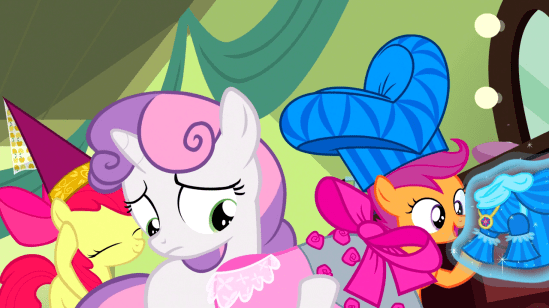 I’d also like to point out that, much like Sweetie Belle, I also don’t give two shits about the flash-in-the-pan pop star of the week. But I am surprised that Apple Bloom would. She seems too smart for that. I mean, Scootaloo, sure, but not Apple Bloom.