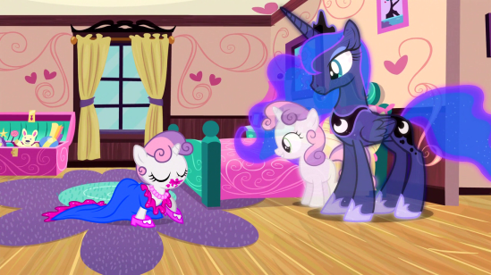 Well, Luna disagrees. And to make her case, she shows Sweetie Belle what Rarity saw that same night.