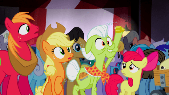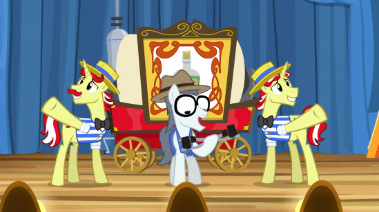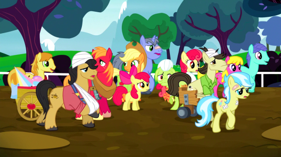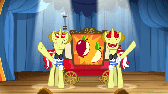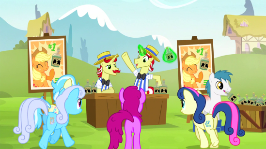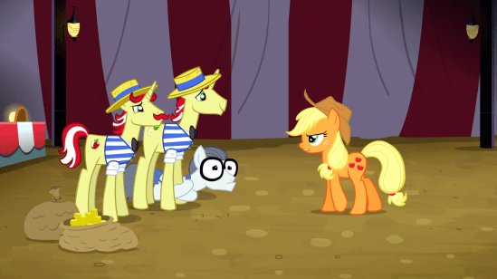 Then, rainbows hit Applejack’s eyes for some reason, and she explains that Flim and Flam were defrauding everyone, and she has to apologize for being an accomplice. Even Silver Shill joins in, inspired by Applejack’s integrity, since he has first-hoof knowledge of the fraud.