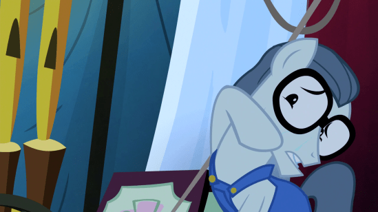Regardless, she decides to visit Flim and Flam, to investigate, and ends up arriving in the middle of one of their sales pitches just in time to see a particular pony wander out the door.