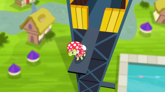 You see, Granny’s going to try to make a five-story jump into a shallow pie-pan full of water. So Applejack saves her, and decides to tell her off. But then Granny argues that the fall wouldn’t have killed her, since the tonic somehow makes her immortal! And Flim and Flam support this conclusion, apparently unaware that if she did die, after they said she wouldn’t, it wouldn’t just fuck up their business-plan, it would land them in jail!