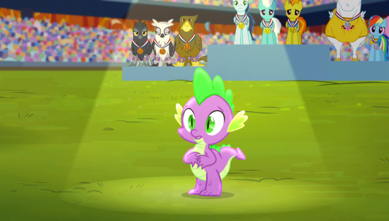 Instead, they merely tell Twilight that Spike stayed behind once they get to the stadium, so she can drag him to the games. And he agrees to go, as long as he can remain incognito.