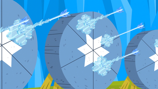 Meanwhile, it’s the final event of the games: The ice-archery finals! It involves shooting magical arrows at a target. The arrows freeze whatever they’re shot at, and the goal is for the competitors to cover their target in ice.