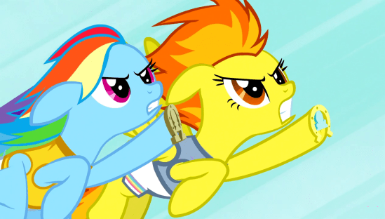 I mean, I get it, you’re up against the Wonderbolts. But you could at least pretend you have a shot! Besides, later on in the episode, we see them compete, and Spitfire wins gold by a hair, leaving Rainbow to nab silver.