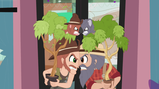 At least with animals you could argue: Well, they’re animals, that’s how they normally express derision. But with humans, we have this tool called language (which the animals also have in this universe, by the way); and with language, we can express exactly why and how we think someone is a bell-end. A better approach to displaying a mutual contempt such as this would be to have constant glaring, and occasional dirty looks, while having every single sentence they speak insult the other person/koala. Preferably a variety of insults and not the same ones over and over again.