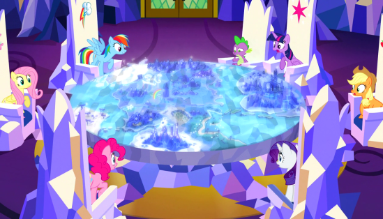 Yes, all six ponies (and possibly Spike) sitting down in their thrones triggers a crystal map of Equestria to pop out of the floor.