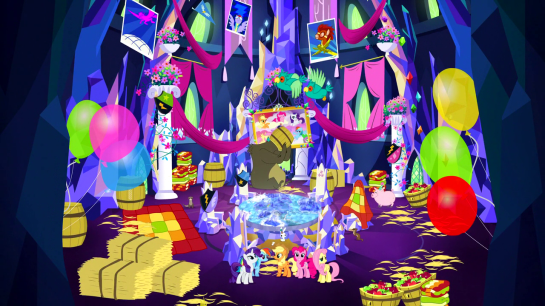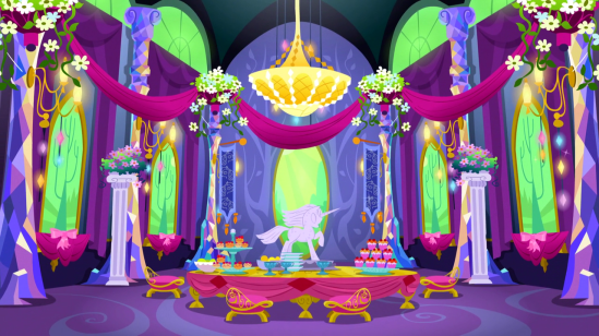 So they decide to celebrate the chandelier with cake, and head straight for the dining hall, which Rarity redesigned behind the others’ backs, because she’s a dick.
