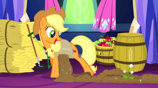 Applejack brings in soil and bales of hay; Fluttershy brings in a menagerie of animals; and the less said about Rainbow and Pinkie, the better.