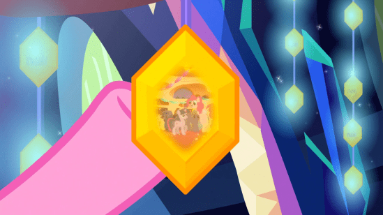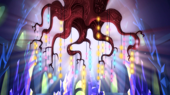 It’s a chandelier, hanging at the top of the throne room, made from the ruins of the old library. Bit dark. And the gems hanging from it contains images of all the fond memories they’ve shared.