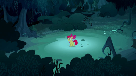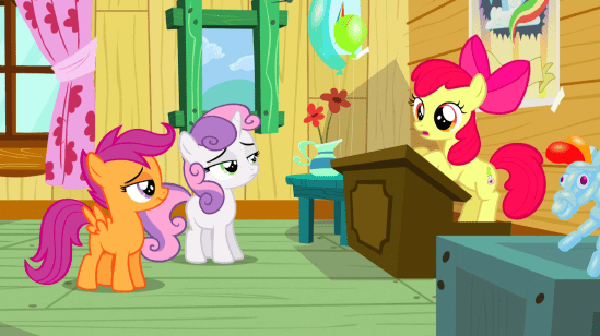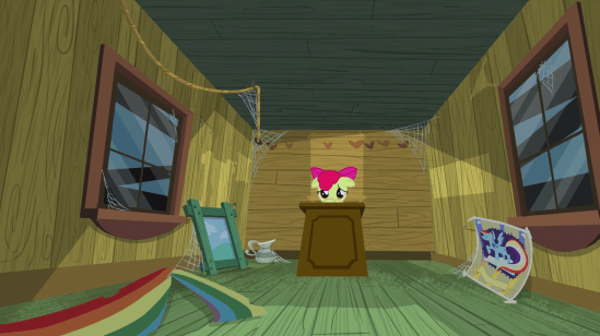 So of course Ghost Glimmer wipes Apple Bloom’s dream mark, and when she returns to her friends to celebrate, turns out they earned their mark in the interim. And what are their marks? Well, we don’t get to see them, because they’re subtly placed out-of-frame. I’m sorry, did I say ‘subtly’? I meant ‘awkwardly.’ But regardless, it leaves Apple Bloom alone in the clubhouse.