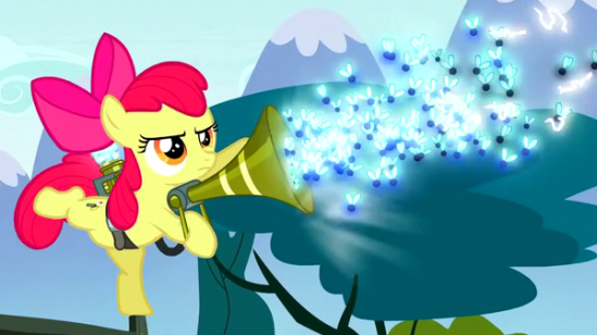 So the old pest pony releases a swarm of them, and leaves it up to Apple Bloom to catch them all. Which she does, and she’s good at it.