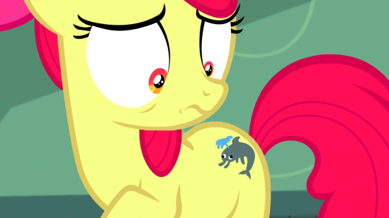 Yes, Apple Bloom. The precocious little filly who’s been spending the last several years desperate to lose her virginity– Uh, I mean, get her cutie mark, is now deathly afraid of it. Oh how times change…