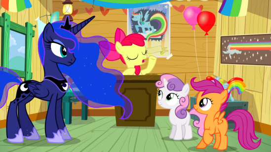 Yes, it’s Princess Dom Cobb again. This time, waiting until the final act before making her appearance. And good on her, because the first time, she overshadowed our heroine; and the second time, Sweetie Belle really needed some direct guidance so Luna’s role was necessary. This time, all she’s really there to do is calm Apple Bloom down, so she doesn’t lose herself and become an old mare, filled with regret, waiting to die alone.