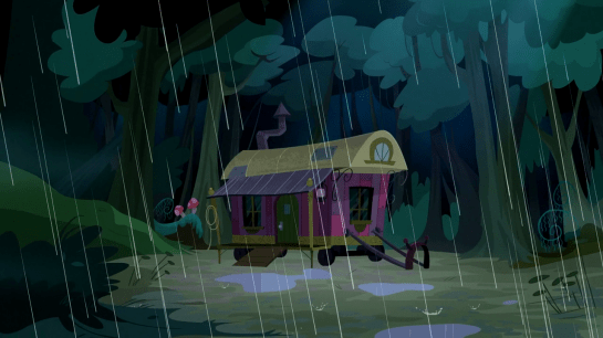 Anyway, to make a long story short (which is something I should be doing more frequently on this site), they wander into the dark wood, it starts raining, they end up getting lost, fall into a river, get more lost, Applejack is informed of their absence, more rain, more lost, then they end up here:
